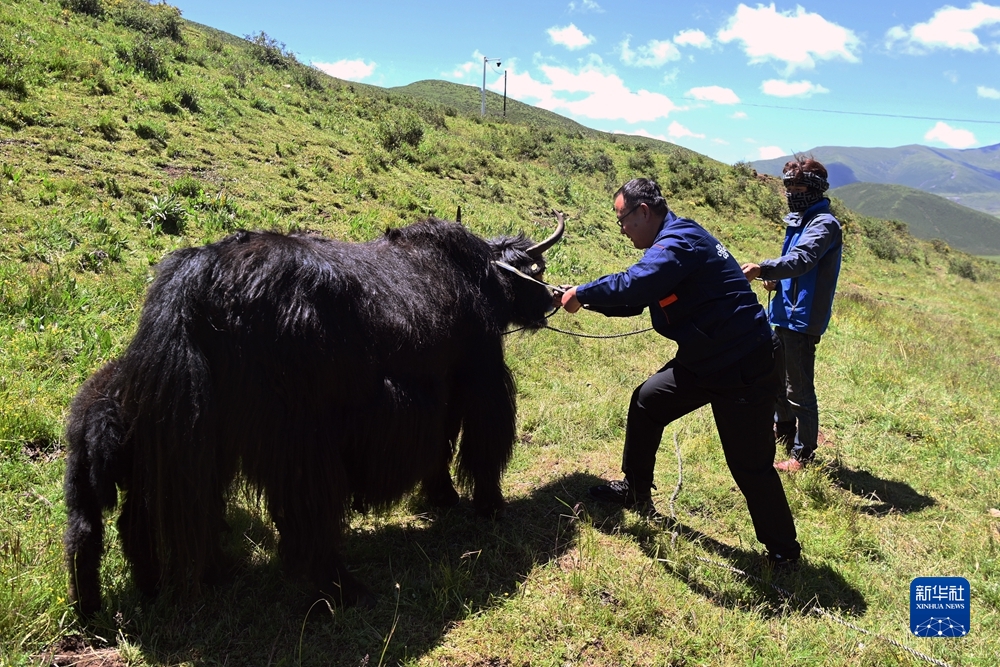 7月22日,在甘德縣生態(tài)畜牧業(yè)聯(lián)合社牦牛養(yǎng)殖基地,技術(shù)人員給牦牛佩戴智能項(xiàng)圈。新華社記者 范培珅 攝