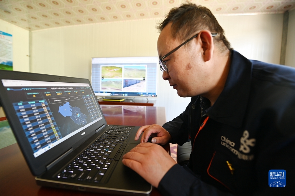 7月22日,在甘德縣生態(tài)畜牧業(yè)聯(lián)合社牦牛養(yǎng)殖基地,技術(shù)人員查看大數(shù)據(jù)平臺(tái)牦牛信息。新華社記者 范培珅 攝