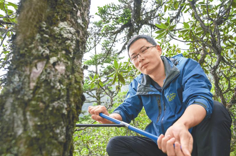 垂直距離只有300米,但密林中的行進(jìn)并不容易。在向?qū)ьI(lǐng)下,王文志和其學(xué)生抵達(dá)了林線處,腳踩松軟的苔蘚,他們展開作業(yè)。