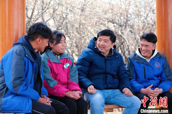 圖為丁志偉(右二)正在與學生聊天。上海市援青干部聯(lián)絡(luò)組供圖