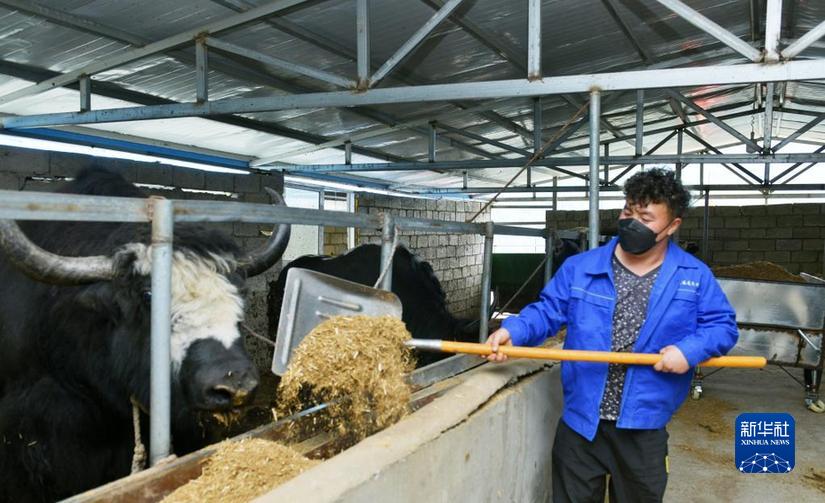 山高云低,在四川省阿壩藏族羌族自治州小金縣美興鎮(zhèn)下馬廠村麻足寨的山頂,村民唐裕龍正給養(yǎng)殖場(chǎng)的牦牛喂飼草、鏟牛糞。