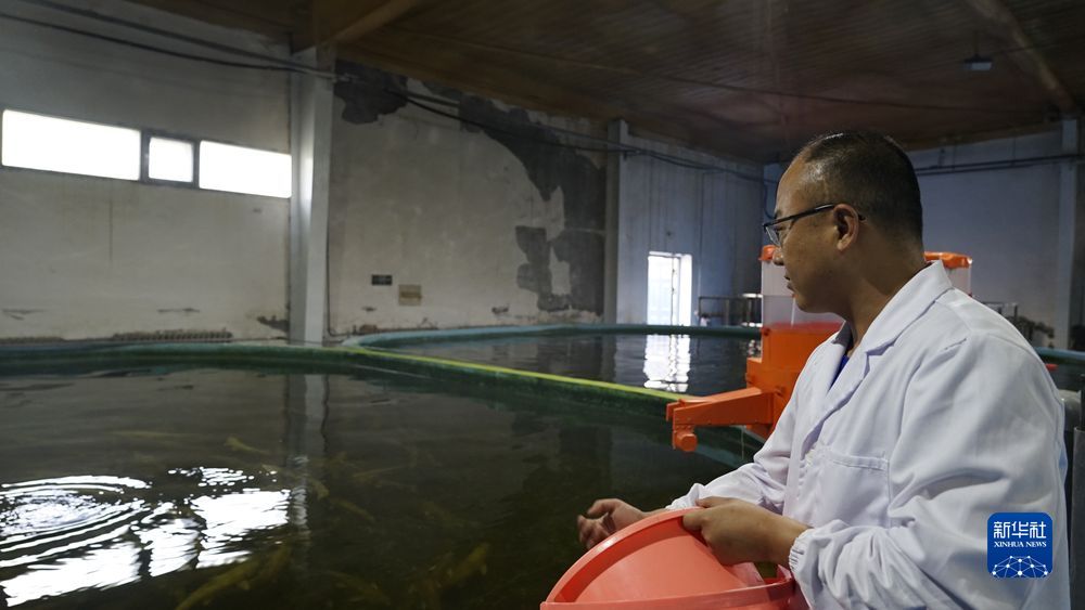 7月6日,青海湖裸鯉救護中心沙柳河泉吉河增殖實驗站的技術(shù)人員在為小魚苗喂食。新華社記者 陳杰 攝