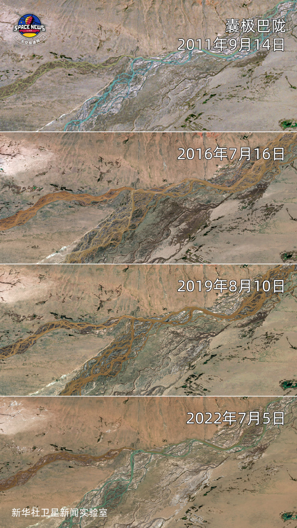 在長江正源沱沱河和南源當曲匯合的囊極巴隴,不同時期的衛(wèi)星圖像清晰顯示,江源水系河道沖淤頻繁,水流不斷分汊又匯集,鳥瞰就像在大地上扎起許多小辮子。
