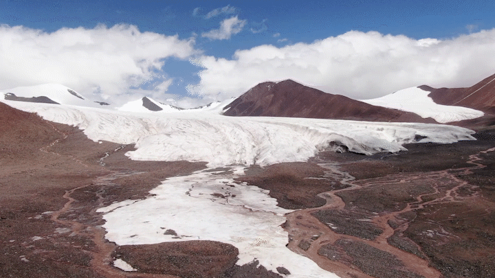 抬頭,是皚皚白雪冰川;腳邊,是冰雪融水奔流。厚厚冰蓋嵌入山谷中,冰川融水隨著河谷順勢而下,匯入長江源水系。