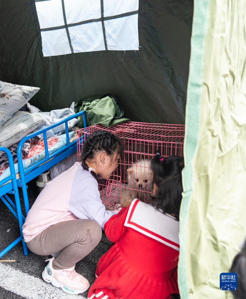 9月6日,在四川甘孜州瀘定縣磨西鎮(zhèn)海螺溝廣場受災(zāi)群眾臨時(shí)安置點(diǎn),兒童與從家中帶過來的小狗玩耍。新華社記者 才揚(yáng) 攝