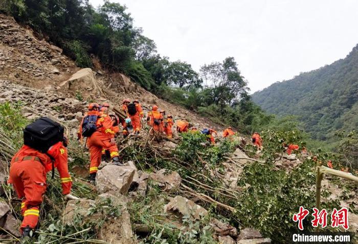 救援人員正在通過地震受損的山體路段。四川森林消防供圖