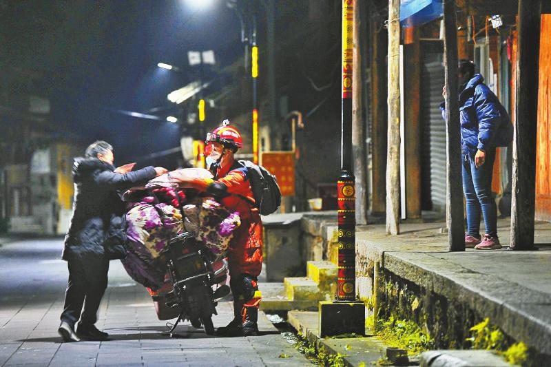 在燕子溝鎮(zhèn)新興老街,搜救排查發(fā)現(xiàn)一戶群眾房屋存在危險,消防隊員馬上幫助住戶收拾棉被和衣物,將其轉移到安置點。