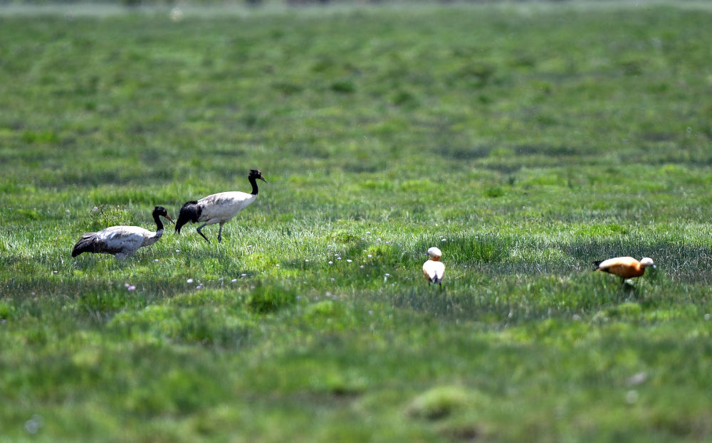 2022年7月2日,兩只黑頸鶴(左一和左二)在青海隆寶國家級自然保護區(qū)內(nèi)活動。新華社記者 韓方方 攝
