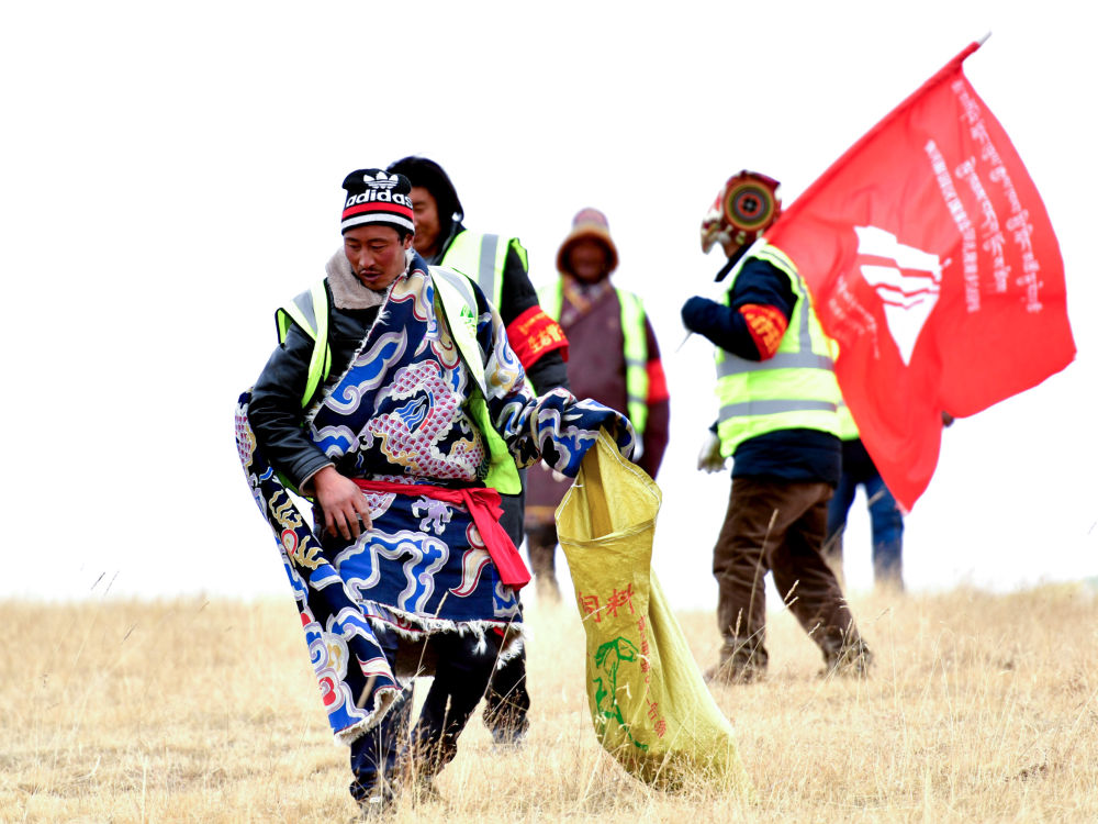 在三江源國家公園黃河源園區(qū),扎陵湖鄉(xiāng)生態(tài)保護站勒那村生態(tài)管護隊第七組的隊員在撿拾垃圾(2018年12月2日攝)。新華社記者 張龍 攝