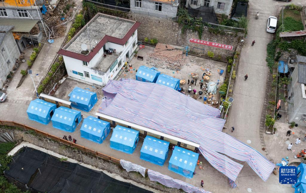9月7日,在雅安市石棉縣王崗坪彝族藏族鄉(xiāng)幸福村村委會小廣場,村民們搭起帳篷吃住在一起(無人機(jī)照片)。新華社記者 才揚(yáng) 攝