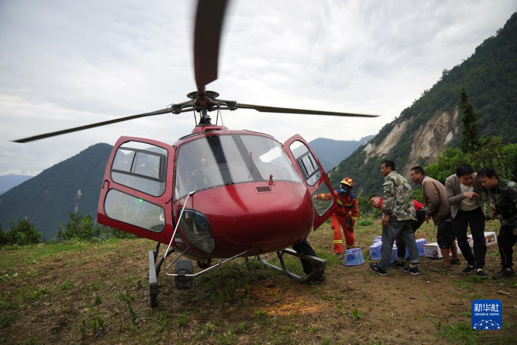 9月7日,在雅安市石棉縣王崗坪彝族藏族鄉(xiāng)幸福村二組,村民與消防救援隊(duì)員搬運(yùn)直升機(jī)送來的水和食物。新華社記者 才揚(yáng) 攝