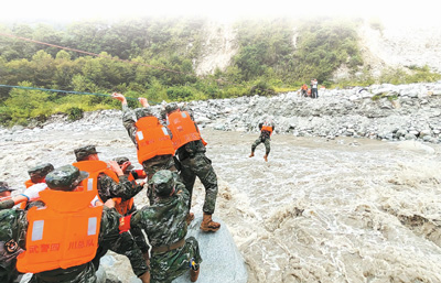 一幕幕救援場景,令億萬網(wǎng)友動容:面對湍急的河水,特警隊員用身體和繩索搭起“生命橋”,全力轉移被困群眾;面對橋梁垮塌,森林消防員自制擔架、木橋,抬傷員過河……