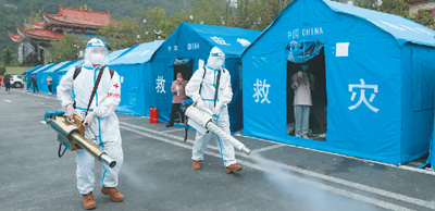 9月6日,武警四川總隊醫(yī)院醫(yī)護人員在瀘定縣磨西鎮(zhèn)臨時安置點開展消殺工作。李華時 攝(人民圖片)