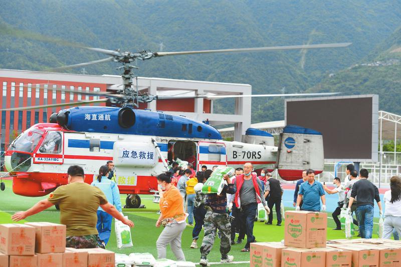 通往石棉縣草科鄉(xiāng)的空中“生命通道”——直升機運送救援物資。 四川日報全媒體記者 王云 攝
