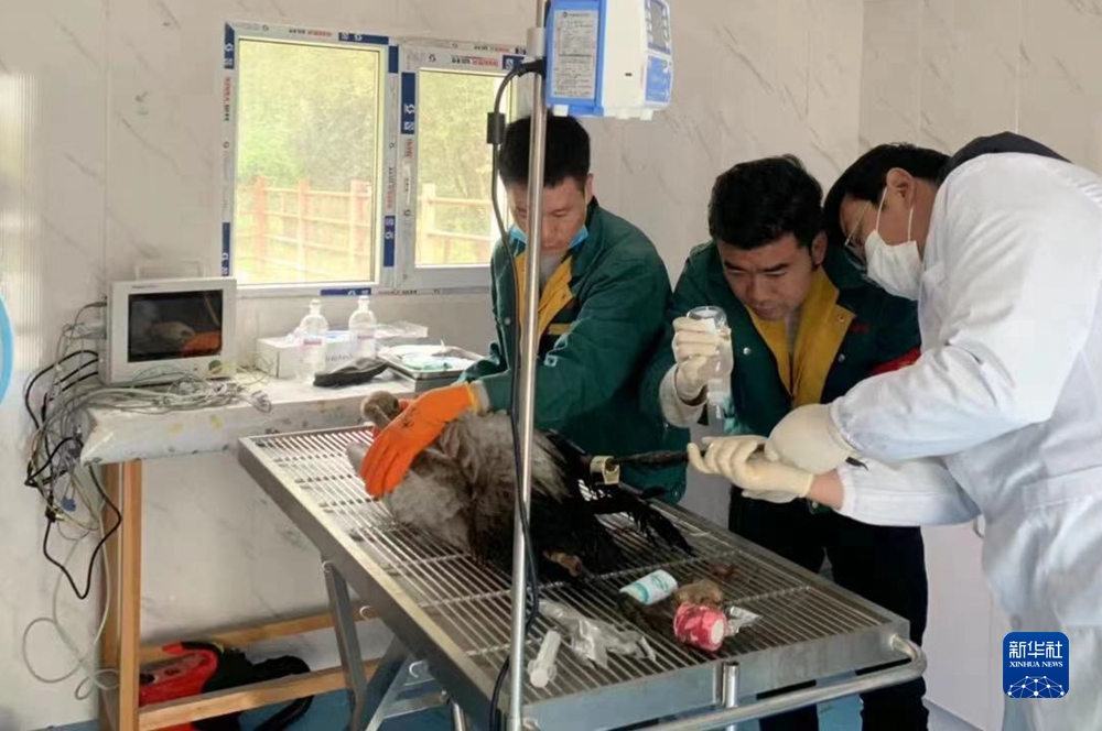 2020年秋季,西寧野生動(dòng)物園的工作人員在救助落單的黑頸鶴“小灰”。新華社發(fā)(西寧野生動(dòng)物園供圖)