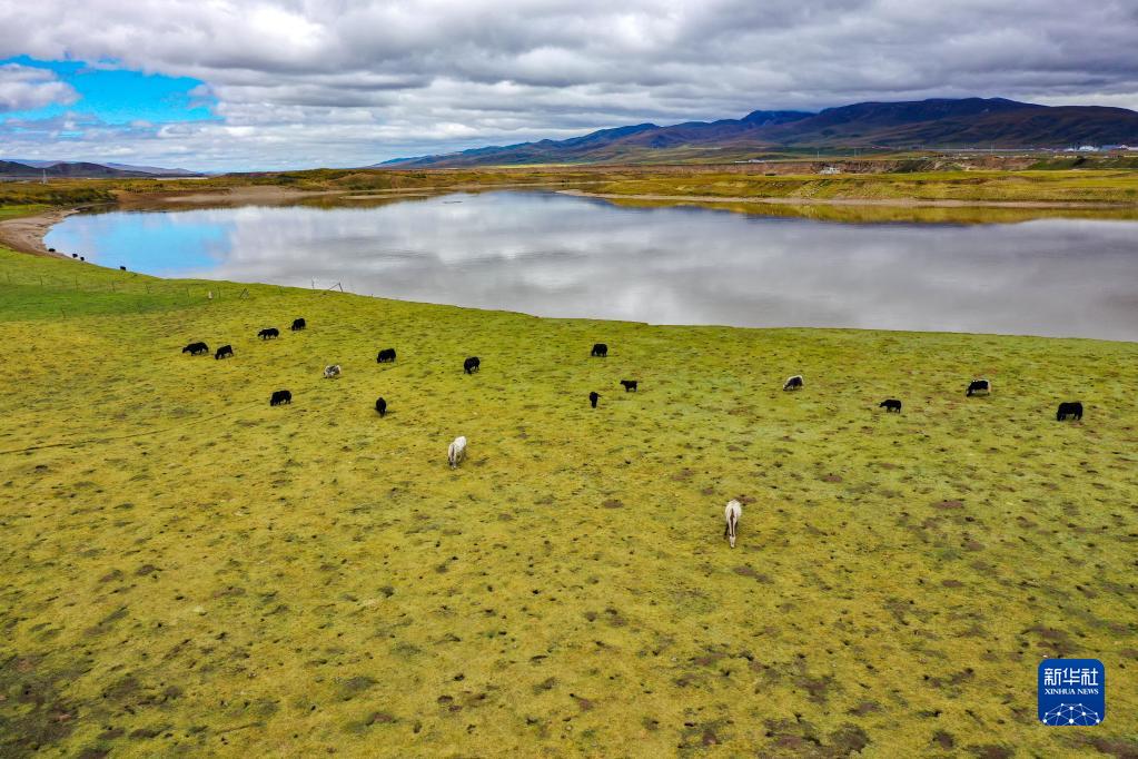 牛群和馬在黃河瑪曲段干流沿岸的一處草地上吃草(9月17日攝,無人機(jī)照片)。瑪曲縣在2019年就實(shí)現(xiàn)了草畜平衡。新華社記者 郎兵兵 攝