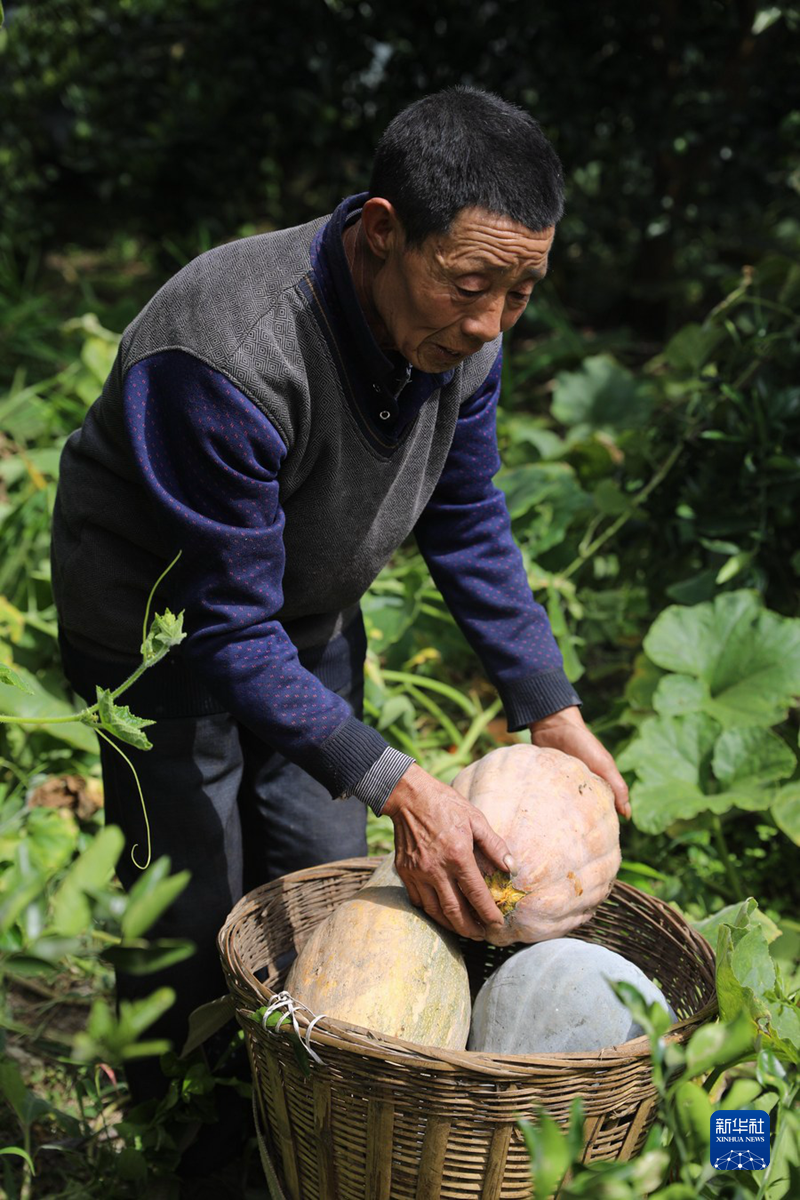 9月10日,在四川石棉縣王崗坪彝族藏族鄉(xiāng)挖角村,村民謝欽明在自家菜地里摘南瓜。新華社記者 劉瓊 攝