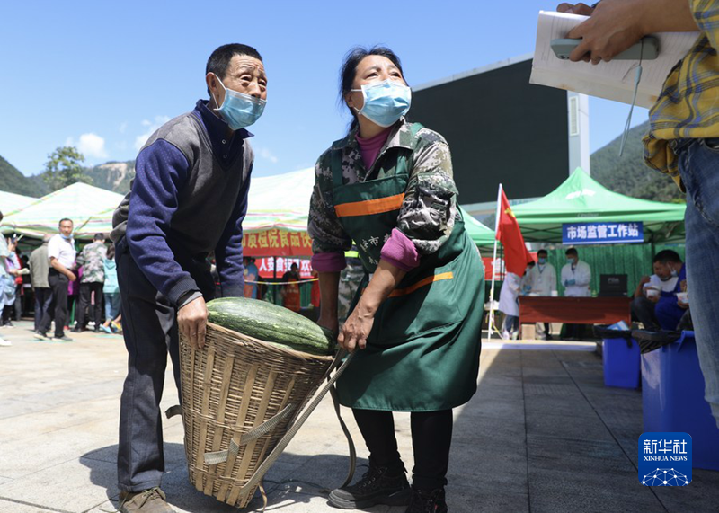 9月10日,在四川省石棉縣王崗坪鄉(xiāng)安置點內(nèi),謝欽明(左)為安置點送來南瓜。新華社記者 劉瓊 攝
