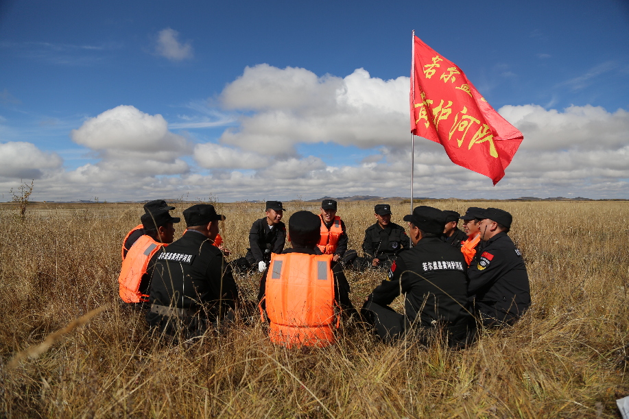在四川省阿壩州若爾蓋縣,部分黃河護(hù)河隊隊員列隊準(zhǔn)備出發(fā)巡河。新華社記者 王曦 攝