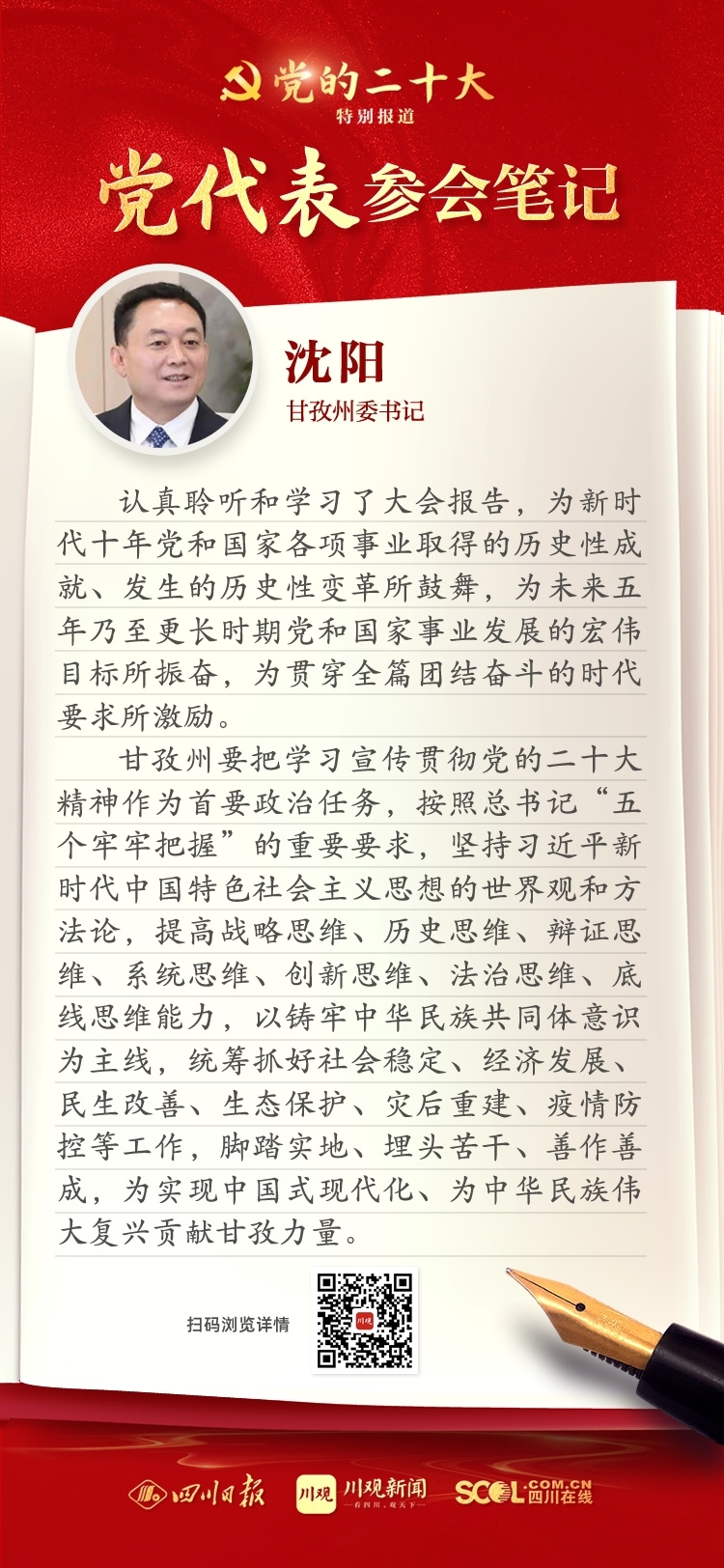 出席盛會(huì),來(lái)自四川的黨代表深感使命光榮、責(zé)任重大,大家認(rèn)真履職,結(jié)合報(bào)告談?wù)J識(shí)、談體會(huì)、談打算。川觀新聞特此推出“黨代表參會(huì)筆記”欄目,分享黨代表們的參會(huì)心得,敬請(qǐng)垂注。