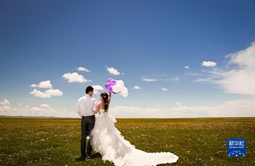 四川若爾蓋濕地國(guó)家級(jí)自然保護(hù)區(qū)鮮花盛開時(shí)節(jié),一對(duì)情侶在拍攝婚紗照(2022年6月24日攝)。新華社記者 江宏景 攝