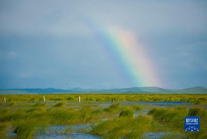 四川若爾蓋濕地國(guó)家級(jí)自然保護(hù)區(qū)若爾蓋花湖上空出現(xiàn)一道彩虹(2022年6月24日攝)。新華社記者 江宏景 攝