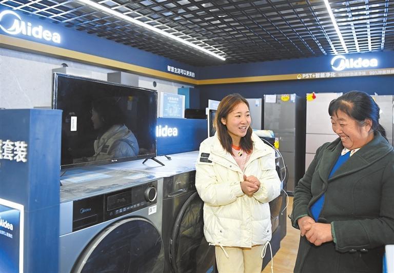 回鄉(xiāng)創(chuàng)業(yè)青年劉金燕向新康村村民介紹自己店里的家用電器。
