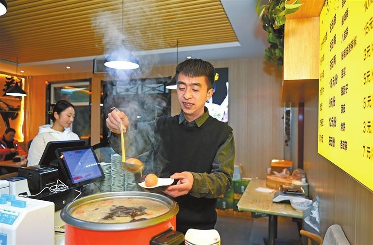 新康村95后創(chuàng)業(yè)青年康凱在熱情地為顧客服務(wù)。