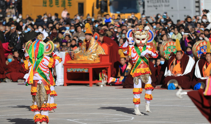 在甘肅拉卜楞寺,頭戴面具的僧人進(jìn)行法舞表演。新華社記者 張智敏 攝