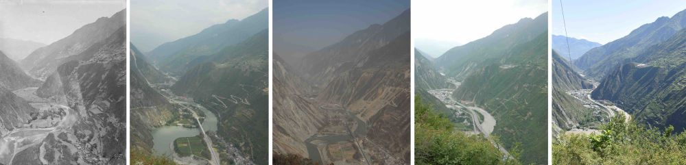 拼版照片:1908年5月27日威爾遜拍攝的岷江河谷(左一,印開蒲供圖)和2007年8月26日、2009年3月14日、2014年6月22日、2019年6月5日由印開蒲拍攝的岷江河谷照片(左二至左五)。新華社發(fā)