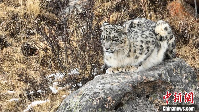 得知情況后,年保玉則景區(qū)管理局立即派員前往現(xiàn)場察看,歷經(jīng)連續(xù)三天的追蹤足跡和蹲點守候,終于在索乎日麻鄉(xiāng)境內(nèi)一處海拔4500米的巖石區(qū)內(nèi),用無人機拍攝到兩只成年雪豹的清晰影像。