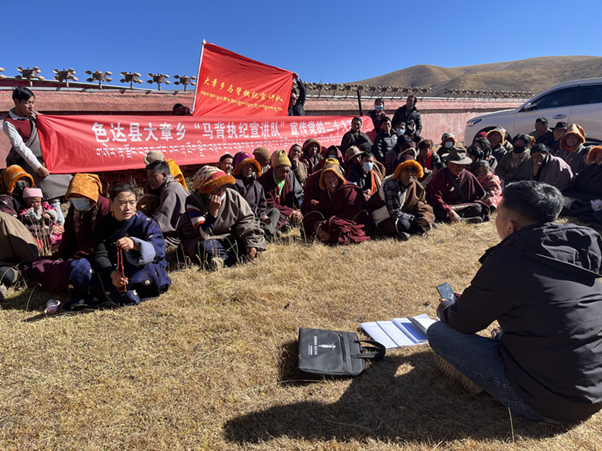 “針對色達(dá)高寒偏遠(yuǎn)、地廣人稀,牧區(qū)群眾生活居住較分散的情況,我們調(diào)配縣鄉(xiāng)村三級紀(jì)檢監(jiān)察力量,逐步組建起精通藏漢雙語、熟悉紀(jì)法知識、擅長群眾工作的馬背執(zhí)紀(jì)宣講隊,把黨的聲音傳遞到云端藏寨、天邊牧場?!鄙_(dá)縣紀(jì)委書記、監(jiān)委主任陳玉龍介紹,黨的二十大以來,宣講隊已開展宣講活動20余場次,推動為群眾辦實事10余件,解決困難訴求20件。