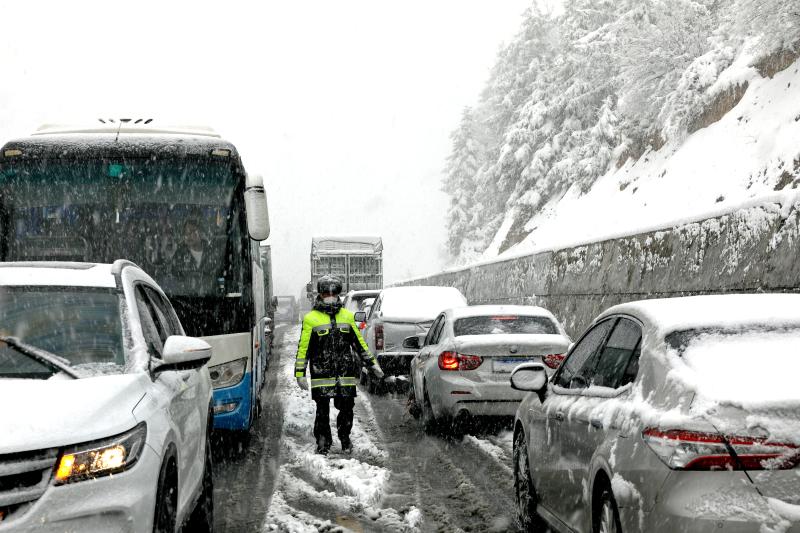 2月22日,大雪使白馬雪山路面積雪結(jié)冰,導(dǎo)致上百輛汽車(chē)擁堵滯留,交警冒著嚴(yán)寒疏導(dǎo)交通。[詳細(xì)] -