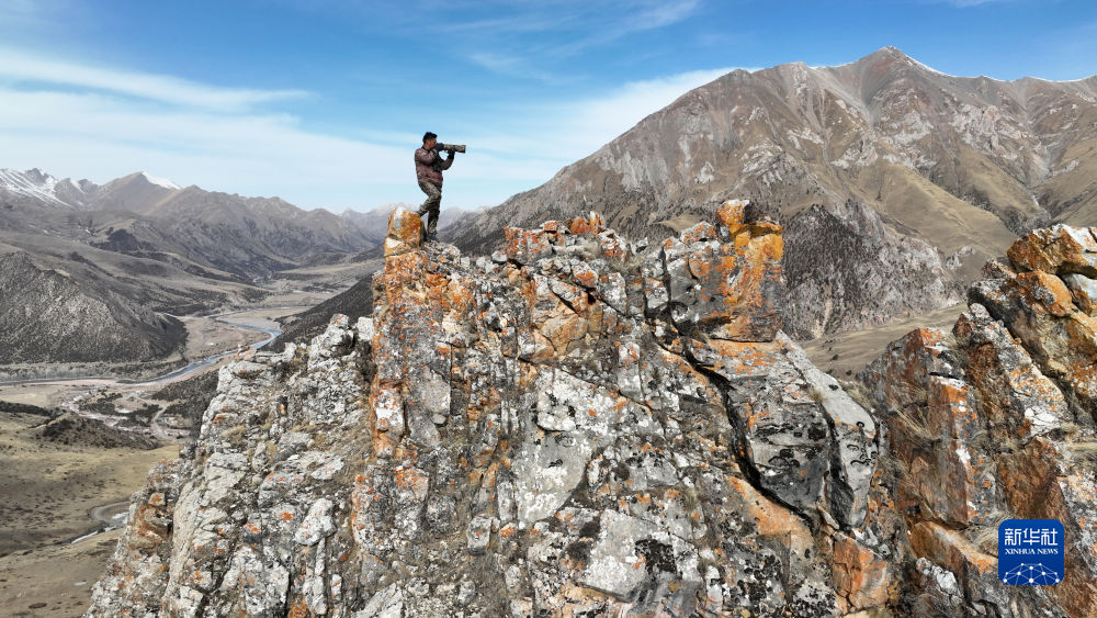 2月22日,更求曲朋在昂賽大峽谷里巡護途中拍照(無人機照片)。新華社記者 張宏祥 攝