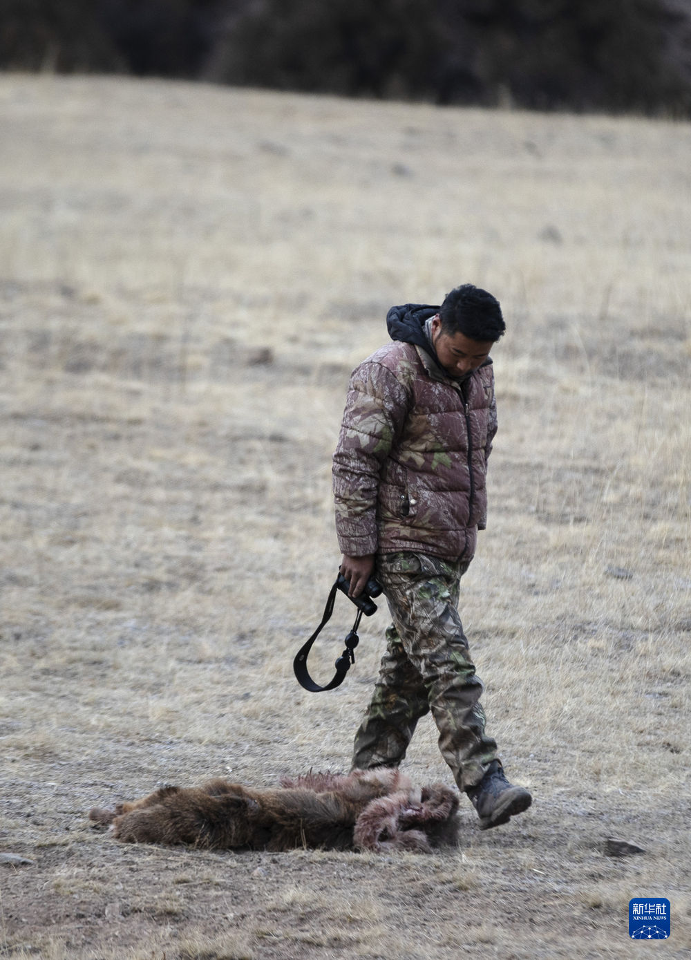 2月21日,更求曲朋在昂賽大峽谷里查看一只被獵殺不久的白唇鹿。新華社記者 費茂華 攝