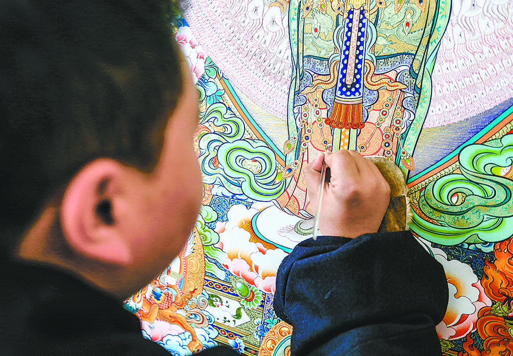 在傳習室西角,畫師范慶基正屏息運筆,面前的畫作只剩下最后幾筆。11年前,范慶基慕名從山東來到龍樹畫苑學習唐卡繪畫技藝,成為國家級工藝美術大師、畫苑的創(chuàng)辦人之一扎西尖措的徒弟,在長達11年的學習中,他已成長為畫苑的骨干畫師。