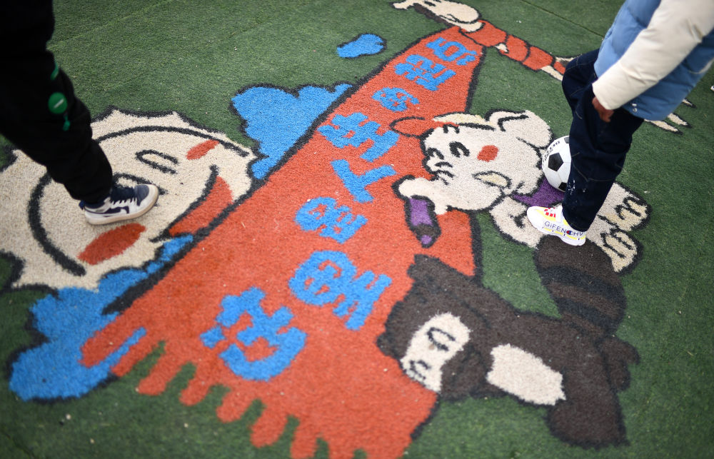 3月1日,在玉樹州治多縣,城南幼兒園小朋友桑周尼瑪(前)在練習(xí)射門。新華社記者 張宏祥 攝