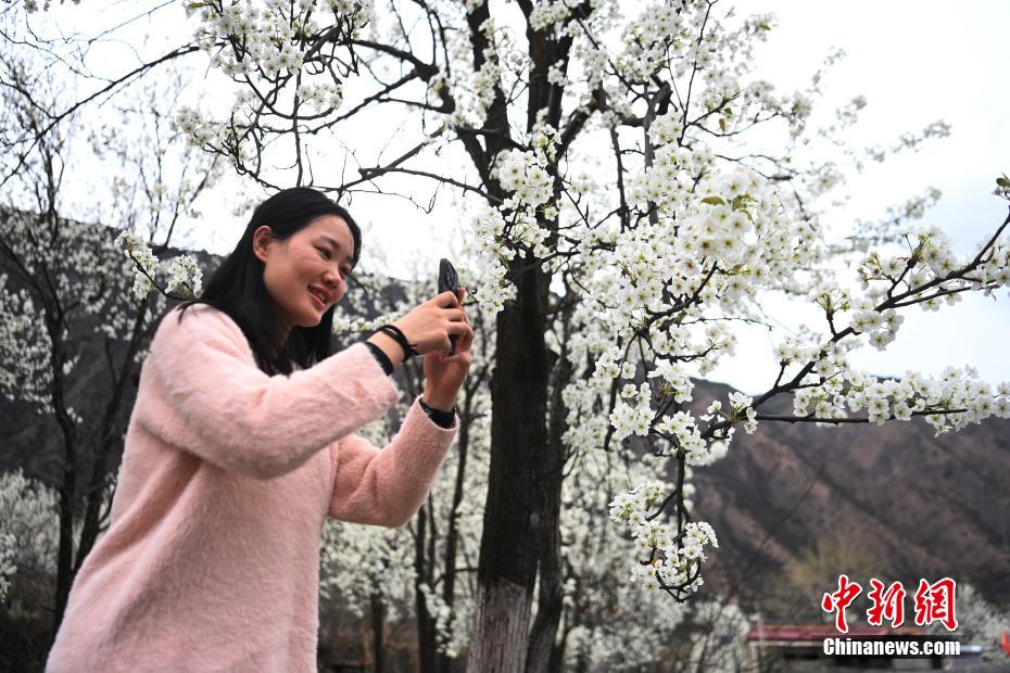 圖為游客在梨花下拍照留念。安源 攝