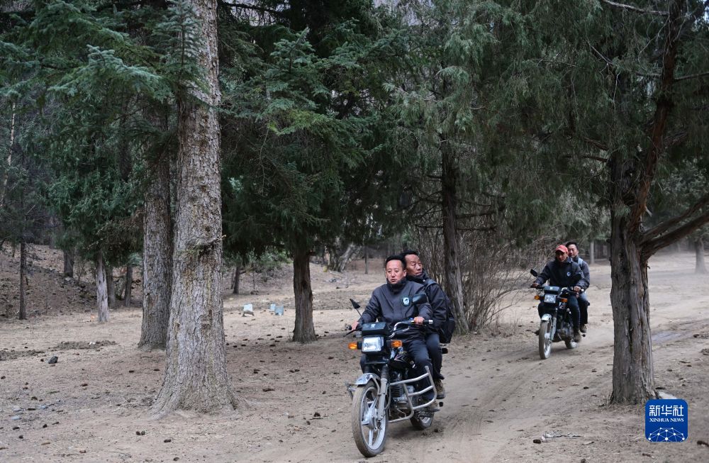 3月24日,在青海省黃南藏族自治州麥秀林場,護(hù)林員騎摩托進(jìn)行巡護(hù)。新華社記者 張龍 攝