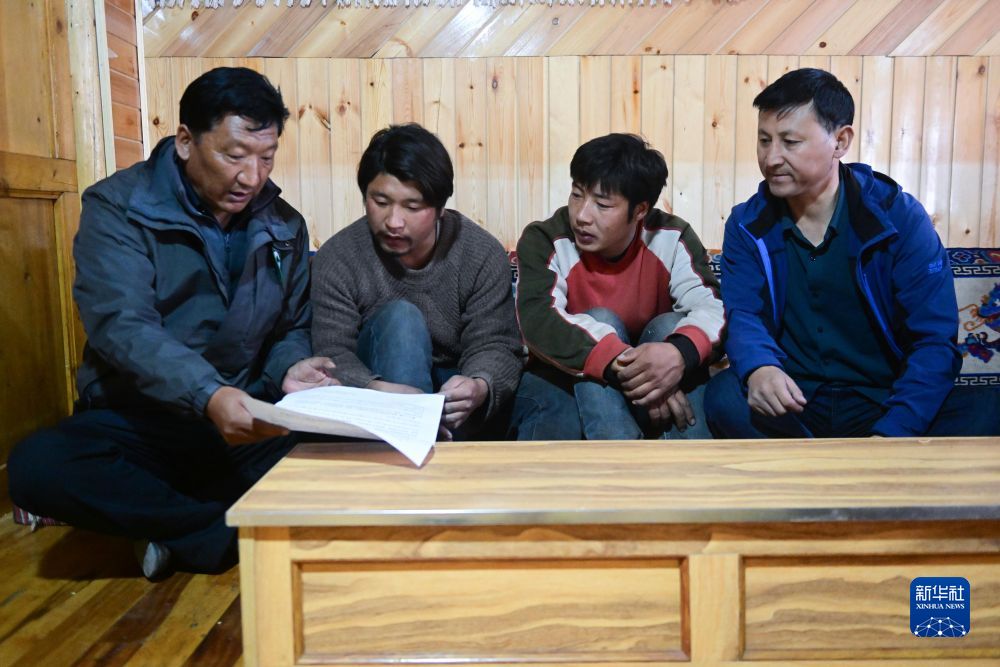 3月24日,在青海省黃南藏族自治州澤庫縣麥秀鎮(zhèn)龍藏村,麥秀林場護(hù)林員(左一)在牧民家中宣傳防火知識。新華社記者 張龍 攝