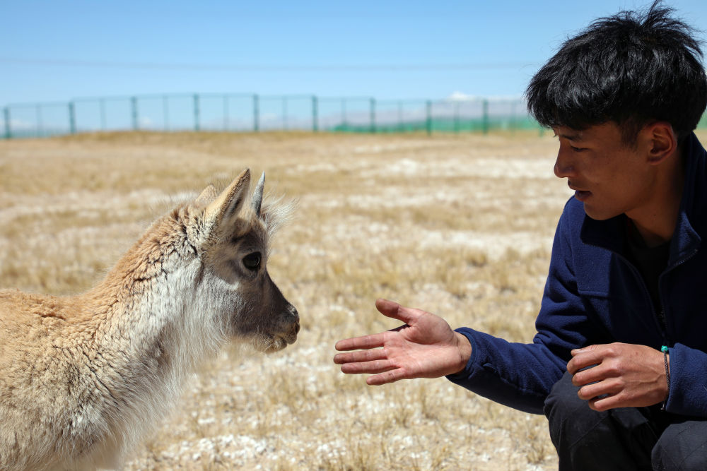 4月15日,獲救小藏羚羊與照顧它的巡山隊(duì)員。新華社記者黃豁 攝