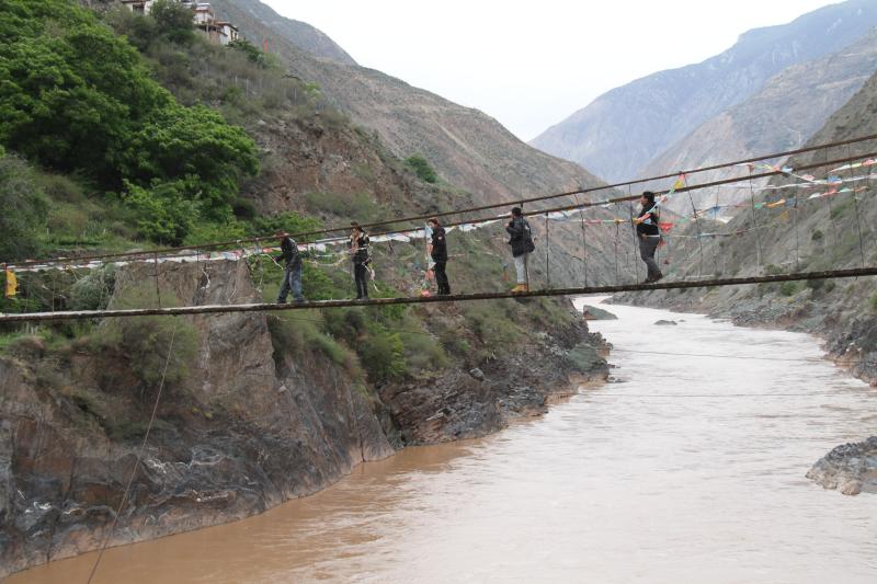近日,“有一種叫云南的生活”大型調(diào)研采訪活動德欽分隊十多名來自省內(nèi)外的記者采訪團走進佛山鄉(xiāng),茶馬古道梅里雪山段瀾滄江上的竹篾溜索、鐵索橋,以及如今還在使用的便橋引起了大家極大興趣。三種渡江方式,代表了三個時代的變遷。離此處500米左右下游的鋼筋混凝土大橋則是近幾年建成的,寬約十米的橋面上汽車轟鳴而過。