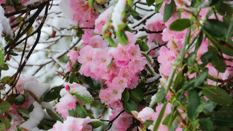 立夏節(jié)氣過(guò)后,香格里拉又迎來(lái)了一場(chǎng)大雪。櫻花、杜鵑花、鳶尾花在雪中競(jìng)相綻放,美如童話世界。