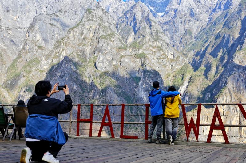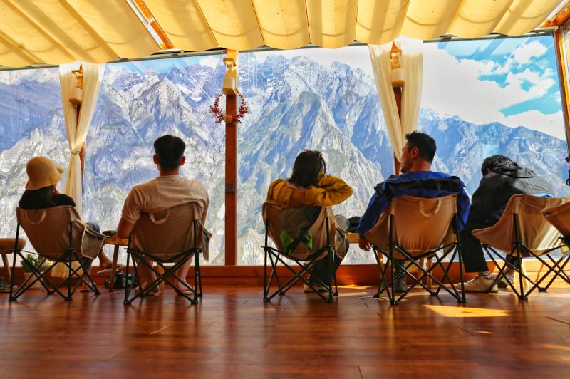 5月17日,游客在香格拉里市虎跳峽高路徒步線路中途客棧小憩,欣賞雪山峽谷壯美景色?;⑻鴯{高路徒步路線為“世界十大經(jīng)典徒步路線之一”,全長(zhǎng)20公里左右,該路線以險(xiǎn)、奇、秀著稱。路線位于哈巴雪山山麓,腳下金沙江水奔涌而過(guò),對(duì)岸是聳立入云的玉龍雪山,一路叢林、峽谷、古道、瀑布等景色美不勝收,每年吸引著數(shù)萬(wàn)名國(guó)內(nèi)外的驢友來(lái)此徒步。