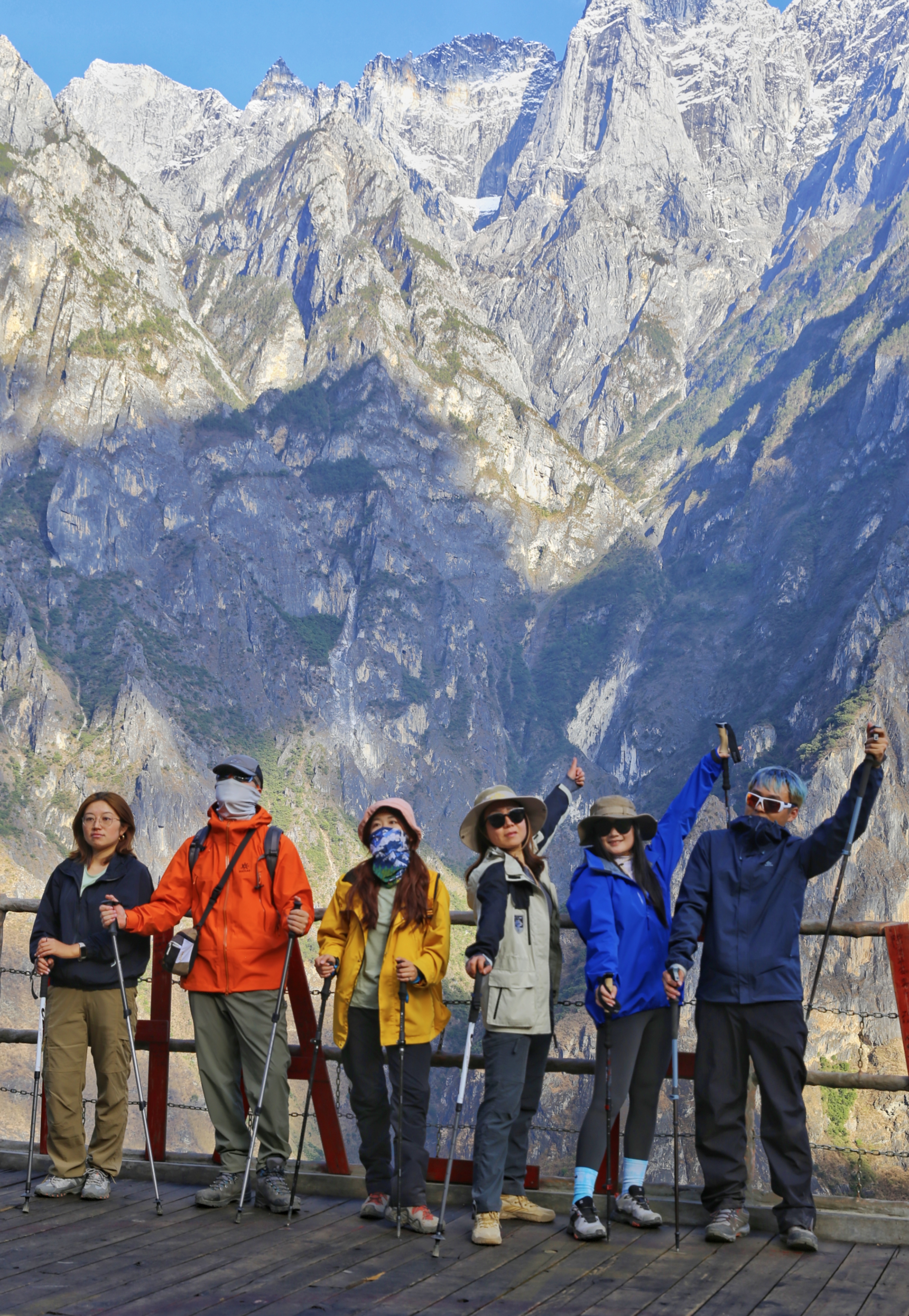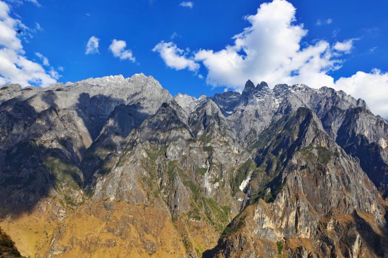 游客在虎跳峽高路徒步欣賞雪山峽谷壯美景色