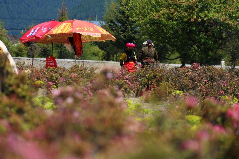 夏天,位于香格里拉市小中甸鎮(zhèn)的杜鵑花海競相綻放,紫色、粉色的花朵開成了海,與藍(lán)天白云遙相呼應(yīng),藏房點綴其間,美不勝收。每當(dāng)花季,當(dāng)?shù)氐睦习傩赵诨ê_厰[起特色美食,牦牛酸奶、苦蕎粑粑、酥油茶等美食供游客享用,坐在花海邊,品嘗當(dāng)?shù)靥厣朗?,是這個夏天小中甸花海獨有的浪漫。