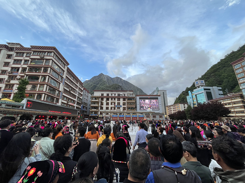 隨著歡快的節(jié)奏,在康定情歌廣場數(shù)以千計的群眾逐漸聚集,伴隨著廣場中央設(shè)置的電子篝火,熱烈的千人鍋莊正式開始。在光影的映照下,康定市民和游客們在情歌廣場圍成同心圓共舞“千人鍋莊”,大家手挽手、肩并肩,水袖揮舞,裙擺搖曳。
