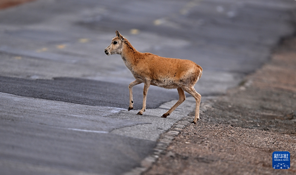 5月29日,在青??煽晌骼铮蝗捍菩源a(chǎn)藏羚羊通過(guò)青藏公路。新華社記者 張宏祥 攝