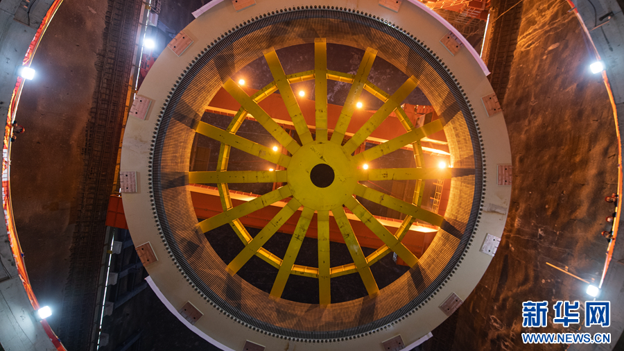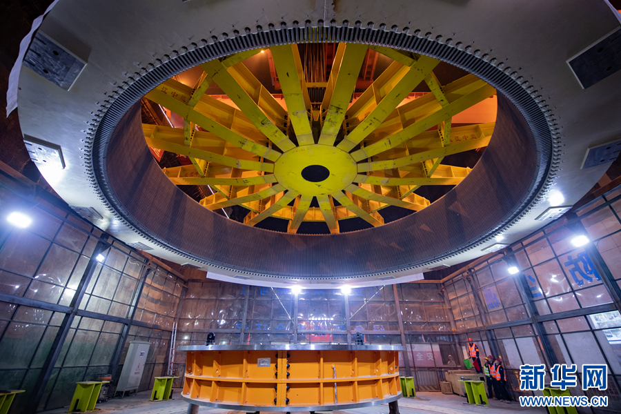 6月30日,瑪爾擋水電站地下廠房內(nèi),工作人員正在進(jìn)行首臺(tái)機(jī)組定子吊裝作業(yè)。新華網(wǎng) 潘彬彬 攝
