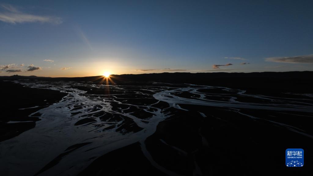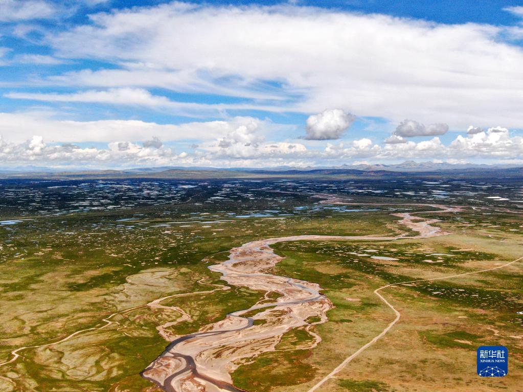 這是2022年7月27日在長江源地區(qū)拍攝的囊極巴隴河道,長江正源沱沱河和南源當(dāng)曲在此匯合(無人機(jī)照片)。新華社記者 肖藝九 攝